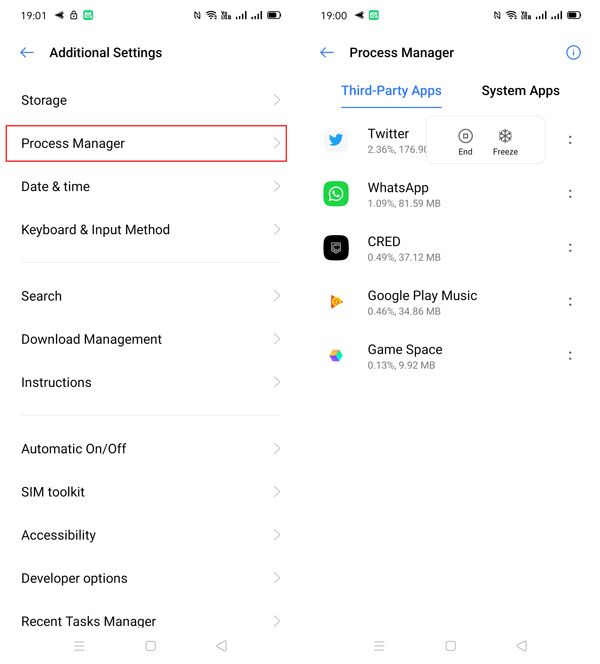 From Settings >> Additional Settings, you can Process manager in Realme UI. From here, you can keep a tab on third-party and system apps running in the background. If you think an app that you don’t use frequently is hogging resources, you may choose to kill it temporarily or to freeze it till the time you next open the app.