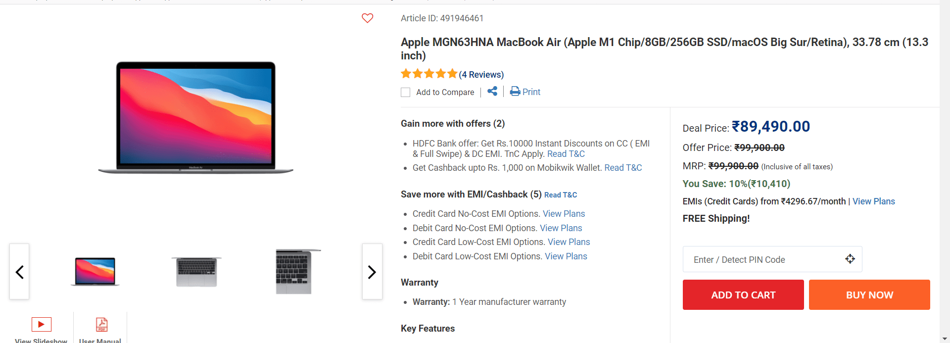 On the Reliance Digital Store, there is a single variant of the laptop that is available for Rs. 89,490. Now, in addition to that, Reliance is giving an instant discount of Rs. 10,000 if you use HDFC Bank Credit Card. You will also get Rs. 10,000 off even when you opt for EMI, No-Cost EMI, and even the upfront payment option. You can choose any method and still get a discount of Rs. 10,000.