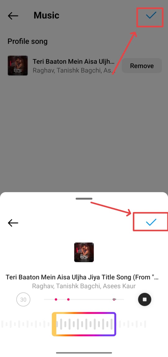 - म्यूजिक की जिस लाइन को प्रोफाइल पर लगाना चाहते है, उस लाइन ट्रिम करें और ऊपर दिख रहे राइट के आइकॉन पर क्लिक करें।