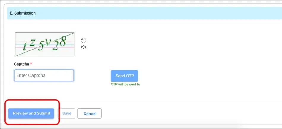 - अब बॉक्स में कॅप्टचा भरें, और ” Preview and Submit” के ऑप्शन पर क्लिक करें।