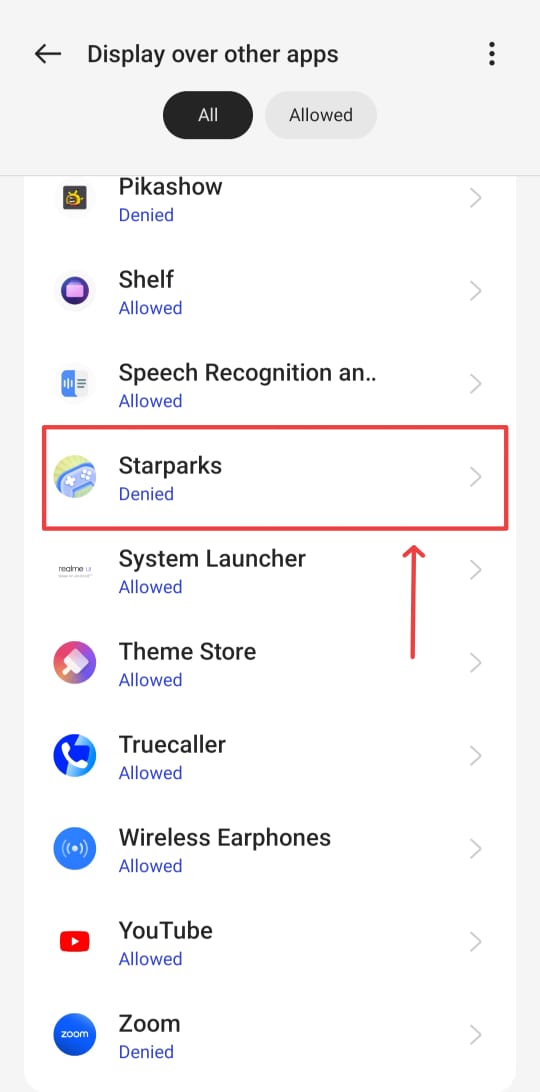 - एक पॉपअप खुलेगा, यहाँ “Open” के ऑप्शन पर क्लिक करें फिर “Starparks” ऐप के ऑप्शन पर क्लिक करें। अब “Display over other apps” के सामने बने टॉगल बटन को ऑन करें, और वापस ऐप में आएं।