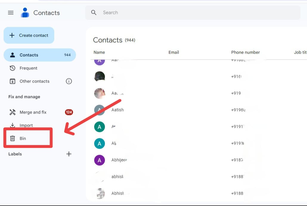 - आपके उस जीमेल में सेव सभी कांटेक्ट नंबर्स की लिस्ट ओपन हो जाएगी यदि सभी कॉन्टेक्ट्स डिलीट हुए हैं, तो बायीं ओर “bin” का ऑप्शन दिखेगा, उस पर क्लिक करें।