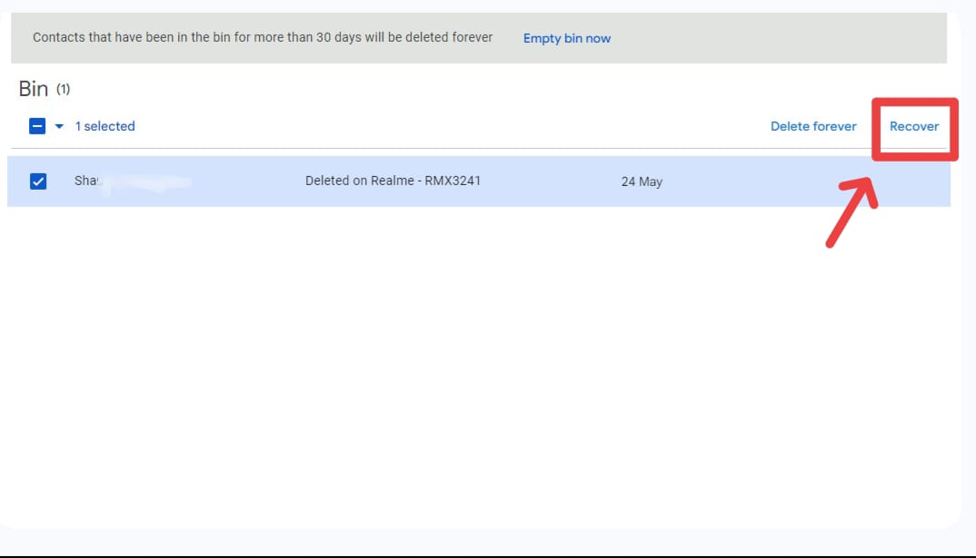 - यहाँ जो कांटेक्ट डिलीट हुए हैं , उनकी लिस्ट दिखेगी। सभी नंबर्स को सिलेक्ट करें, और रिकवर के ऑप्शन पर क्लिक करें।