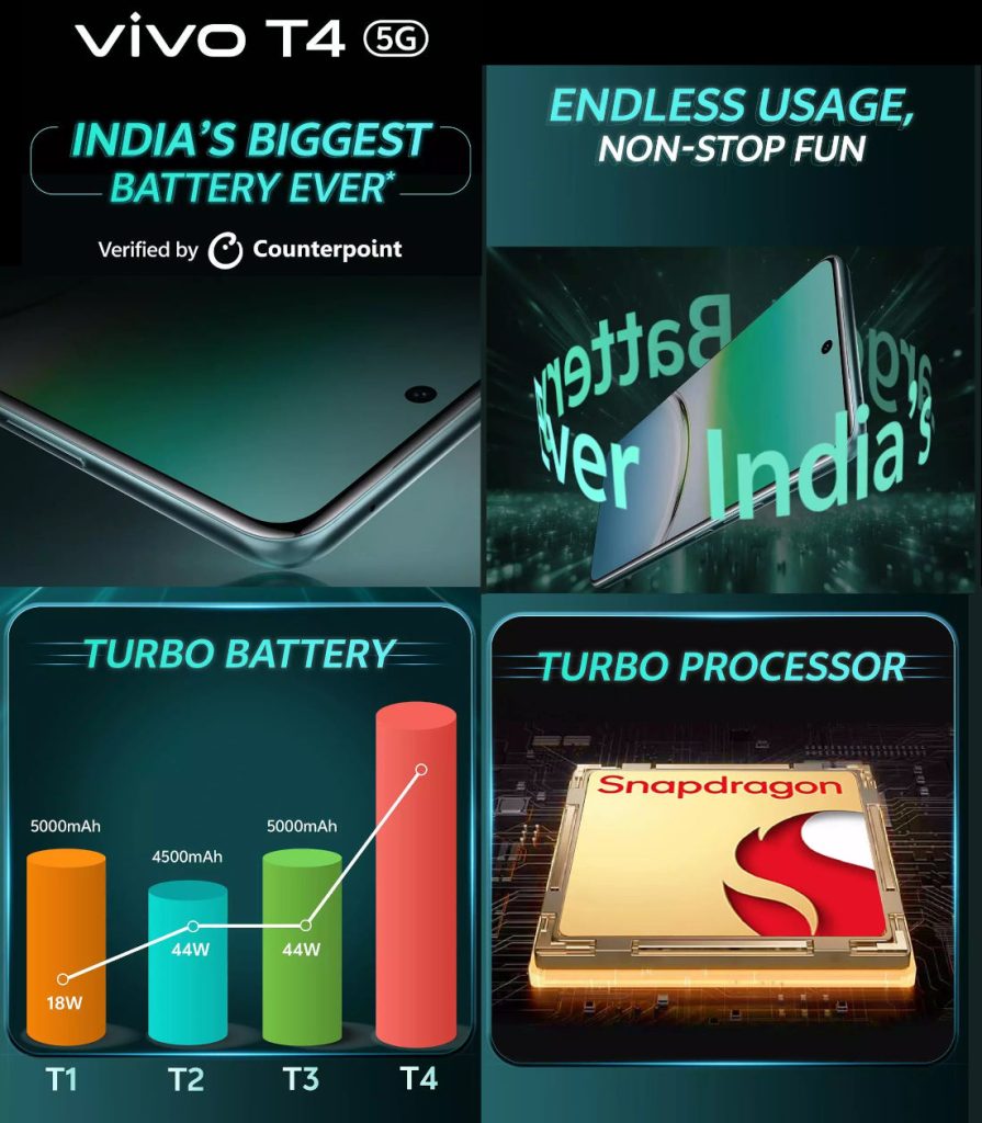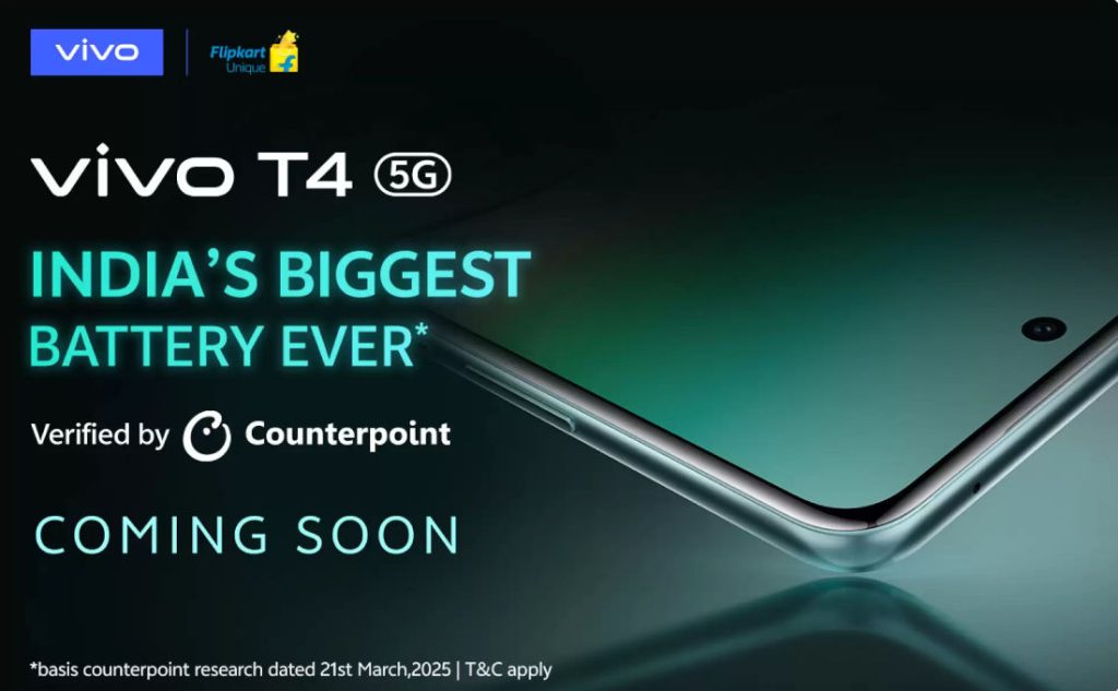 Vivo जल्द ही भारत में अपना बड़ी बैटरी वाला मिड रेंज फोन लॉन्च करने वाला है, जिसमें आपको 7300mAh की बैटरी देखने को मिलेगी। हाल ही में कंपनी ने Vivo T4 5G इंडिया लॉन्च का ऑफिशियल टीजर साझा किया है, जिसे अगले महीने Vivo T3 5G के अपग्रेडेड वर्जन के रूप में पेश किया जा सकता है। आगे Vivo T4 5G फीचर्स, कीमत, और लॉन्च से संबंधित सभी चीजों के बारे में विस्तार से जानते हैं।